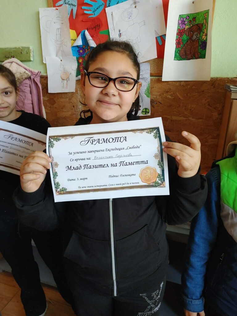 В 4. клас се проведе „Експедиция СВОБОДА“, в която децата рисуваха, свързваха, смятаха и откриваха пътя към свободата. Участниците, стигнали успешно до края на експедицията, получиха грамоти „МЛАД ПАЗИТЕЛ НА ПАМЕТТА“.